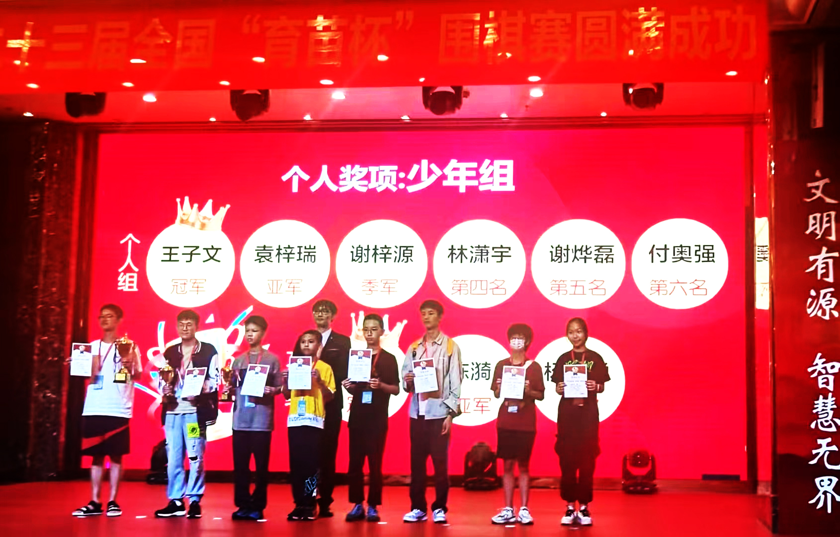 8月25-27日,第二十三届全国“育苗杯”围棋赛在湛江举行,谢烨磊荣获少年组第五名。